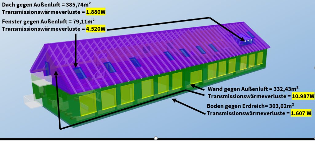 Im 2. Schritt werden die beiden Verluste des beheizten Raums addiert. Dazu kommt ein weiterer Wert für die Aufheizleistung (zusätzliche Leistung für den Ausgleich bei unterbrochener Beheizung).
